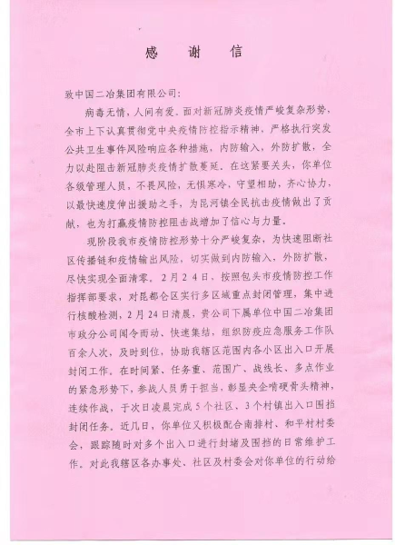 中國(guó)二冶收到昆河鎮(zhèn)政府感謝信 ——表?yè)P(yáng)中國(guó)二冶抗疫中的央企擔(dān)當(dāng)